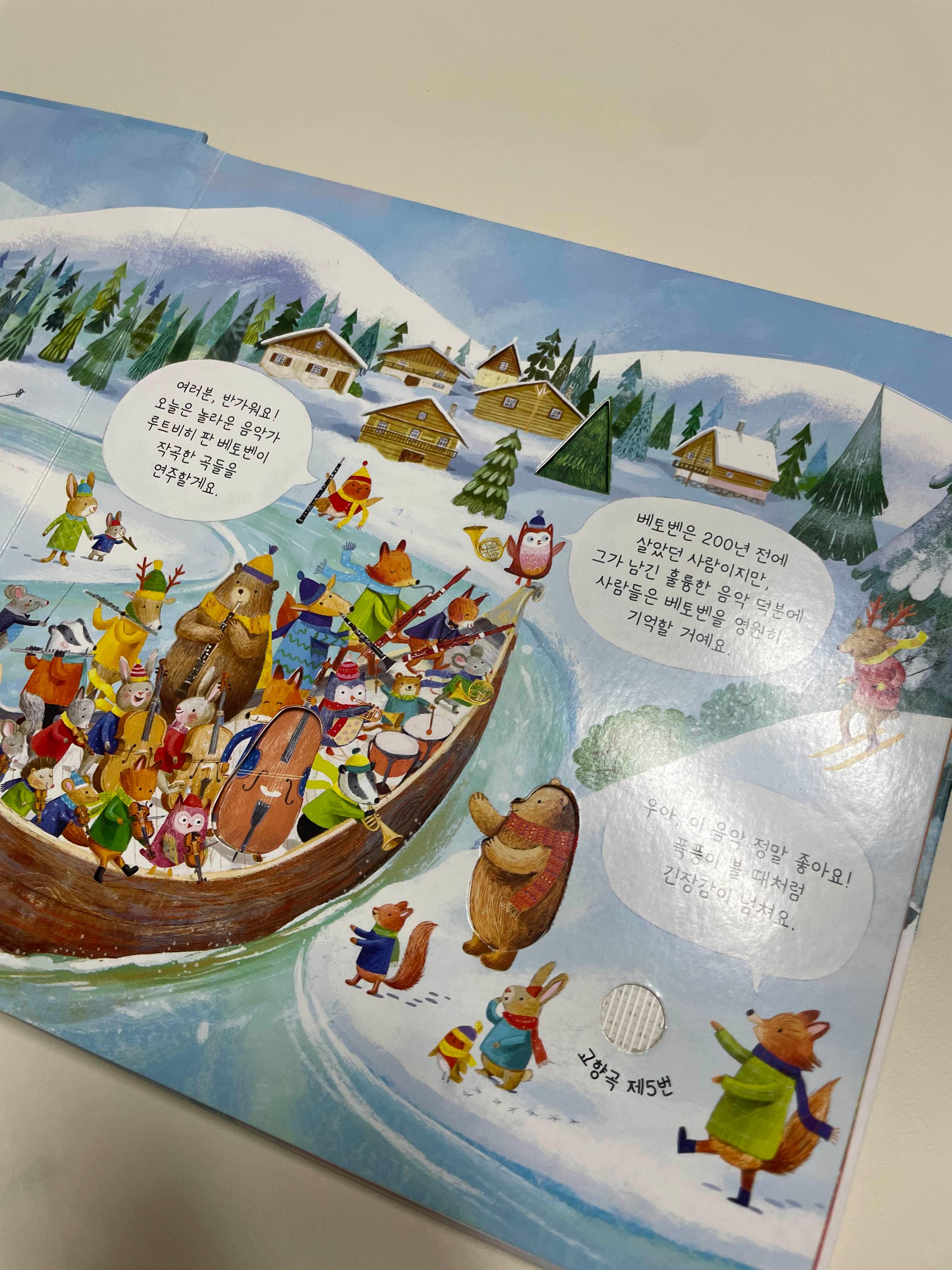 이 책의 가장 큰 장점은 바로 *생생한 사운드'예요. 책 표지에 있는 스피커 모양의 버튼을 누르면 고품질의 웅장한 베토벤 음악이 흘러나와요. 단순한 멜로디가 아니라 실제 오케스트라 연주를 녹음한 듯한 풍성하고 입체적인 사운드라, 아이뿐만 아니라 어른이 들어도 감동적이에요.