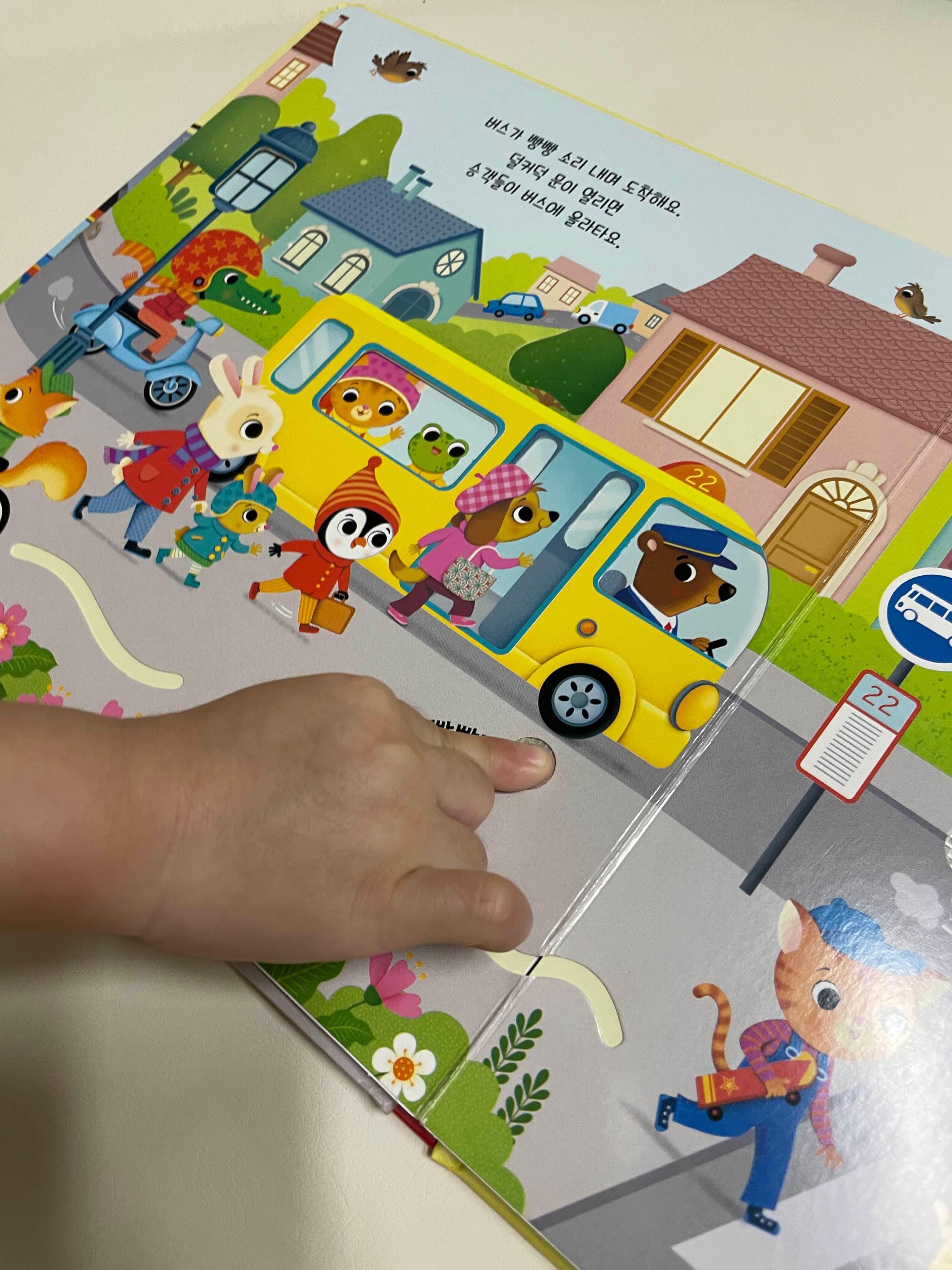 책장을 넘기면, 마을, 바다, 공사장, 농장, 하늘 등 다양한 장소가 펼쳐져요. 각 페이지에는 그곳에서 볼 수 있는 여러 가지 탈것들이 알록달록한 그림으로 그려져 있답니다. 그리고 각 탈것 옆에 있는 버튼을 누르면, 기차의 '덜컹덜컹!', 버스의 '빵빵!', 배의 '뿌웅뿡!', 굴착기의 '드르르!', 비행기의 '부우웅!' 등 실제 소리가 아주 실감 나게 흘러나와요. 소리를 들으며 아이는 탈것의 이름을 자연스럽게 익히게 되고, 이 과정에서 청각 기억력과 언어 발달이 함께 이루어지죠.