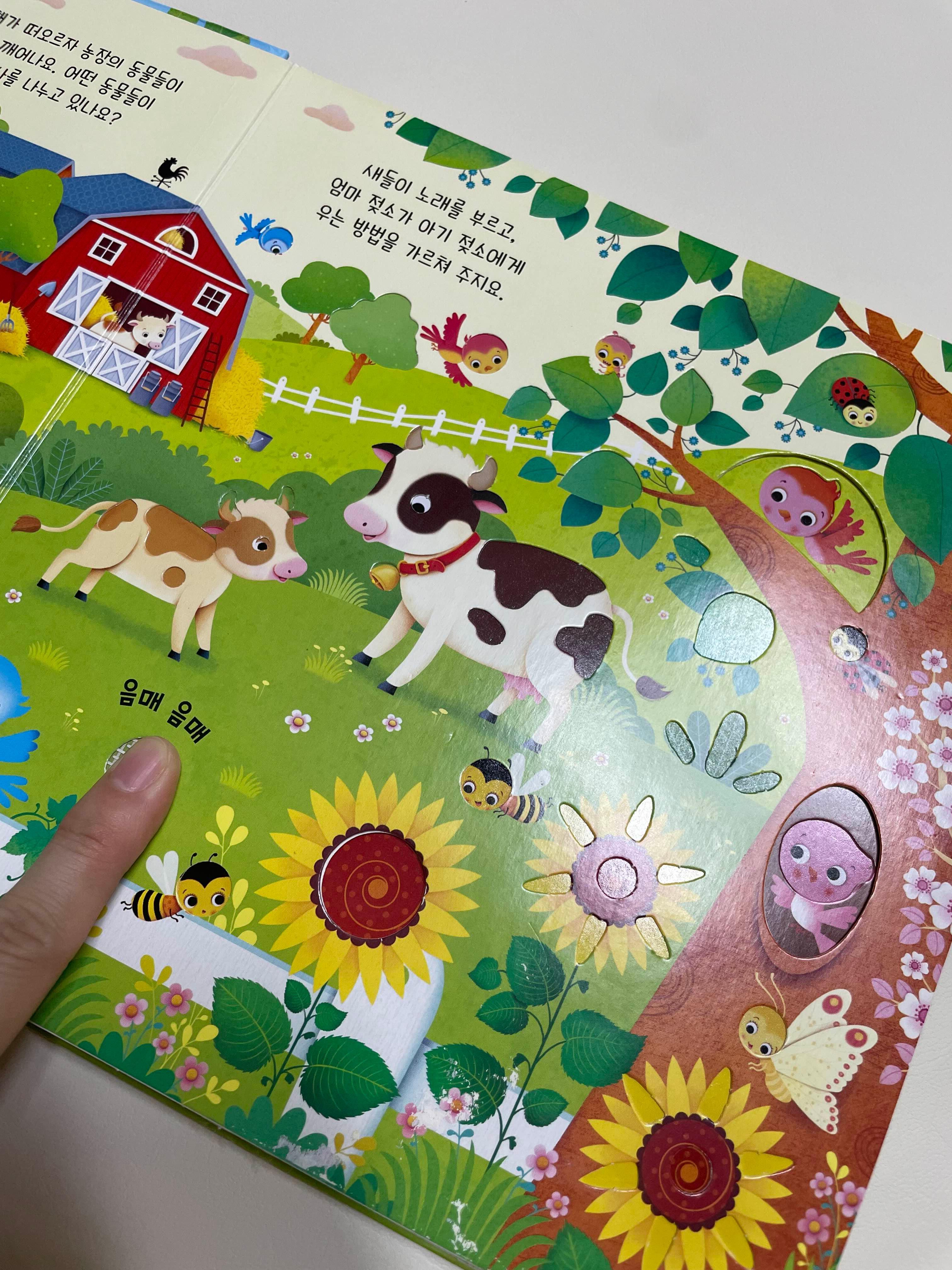 호기심과 집중력은 아기 두뇌 발달에 아주 중요한 요소인데요. 다양한 소리를 듣고 그 소리가 어떤 동물에게서 나는지 연결 짓는 활동 자체가 훌륭한 청각 발달 훈련이 돼요. 저는 소리를 들려준 후 "자, 이 소리는 누구 소리일까?" 하고 물어보면서 아이의 능동적인 사고를 유도하고 있답니다. 집에서도 시골 농장의 풍경을 간접적으로 체험하게 해 줄 수 있어 더욱 만족스러워요.