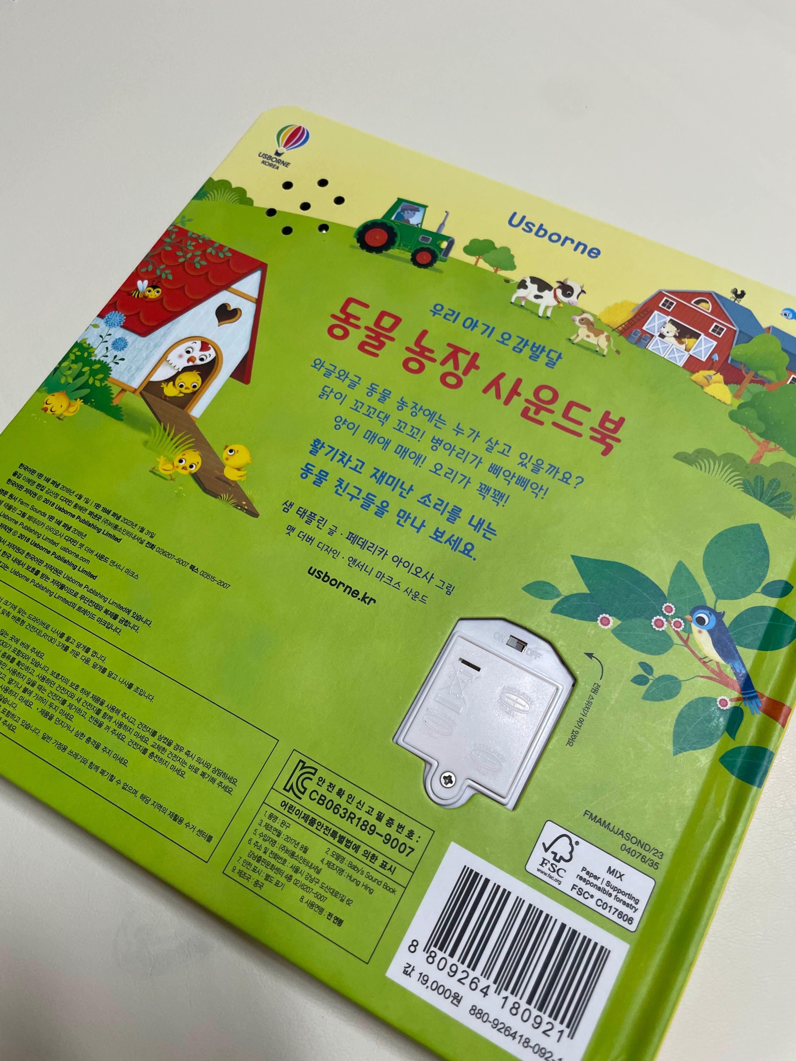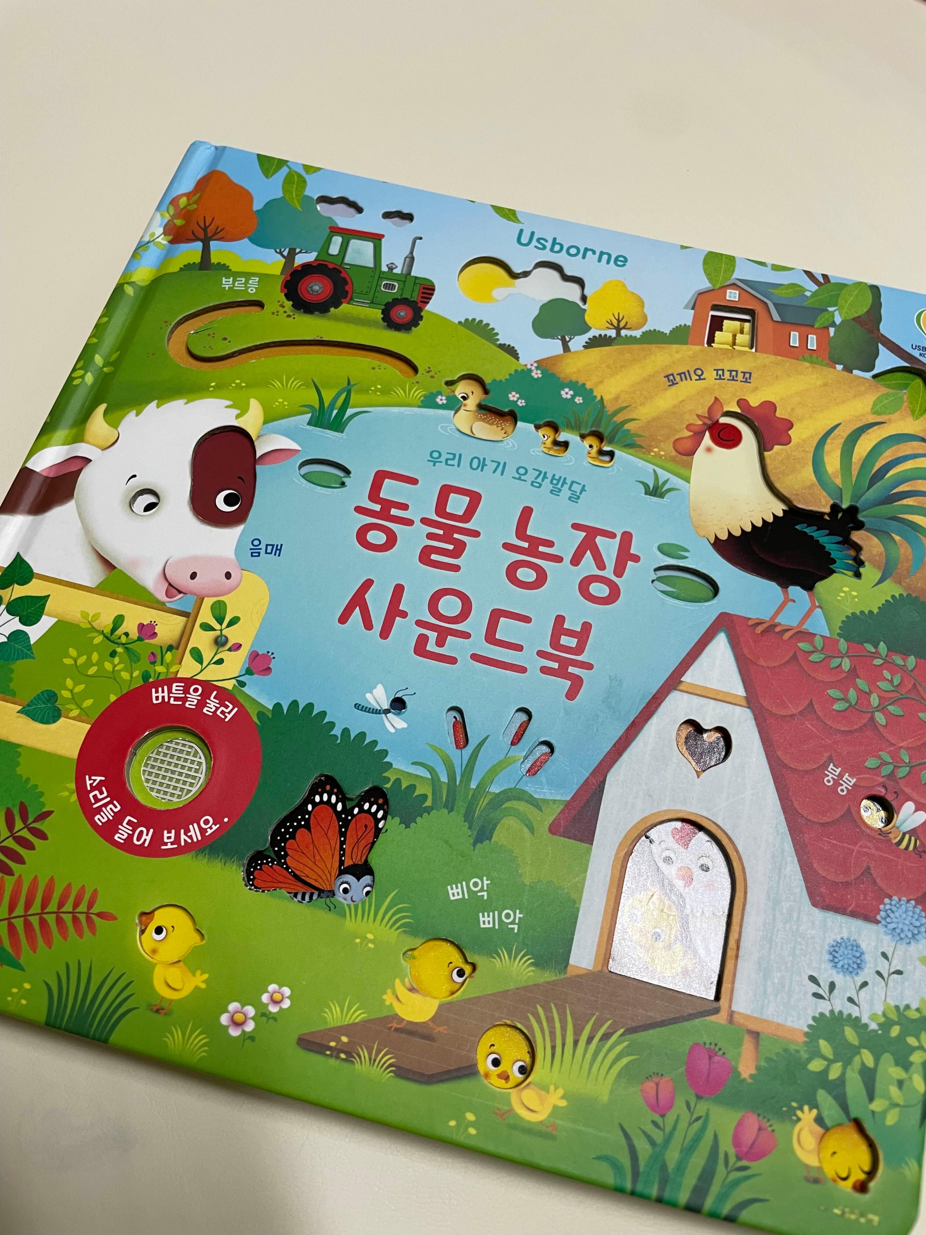 사운드 버튼을 누르면 닭의 꼬꼬댁, 병아리의 삐약삐약, 양의 매애 매애, 오리의 꽥꽥 같은 동물 울음소리뿐만 아니라, 트랙터 소리까지 들을 수 있어요. 우리 아기는 처음 이 소리를 들었을 때 눈이 동그래지면서 소리가 나는 쪽을 향해 집중하는 모습을 보였답니다.