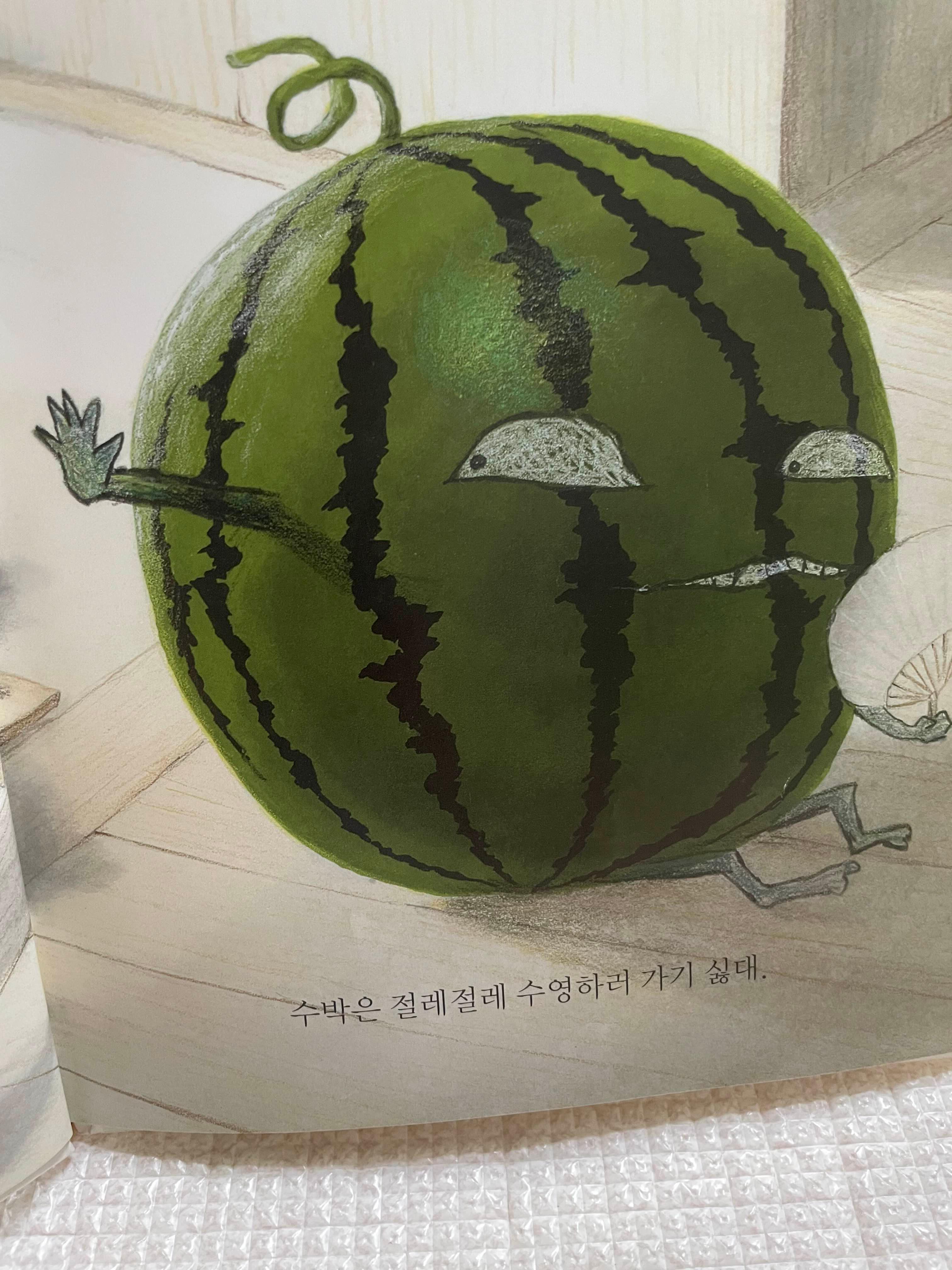 수박: 덩치가 커서 움직이기가 귀찮은지 집에서 부채질만 하는 수박의 모습은 왠지 모르게 나른한 여름날을 떠올리게 합니다. 시원한 수박의 속성 그대로 게으른 휴가를 즐기는 모습이 유머러스해요.