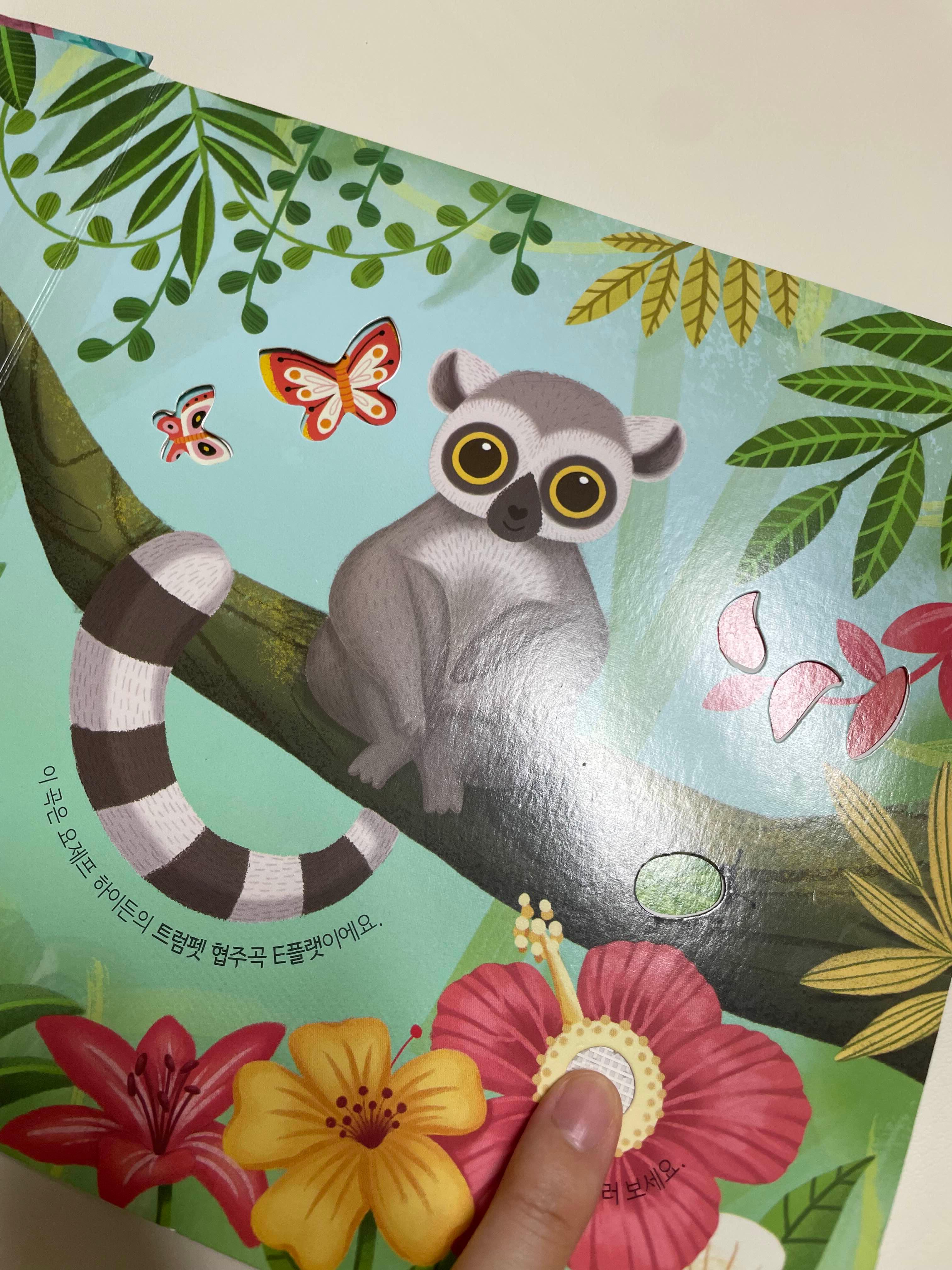 또한, 책 전체적으로 부드럽고 차분한 색감의 그림이 돋보여요. 동물들뿐만 아니라, 그 주변 환경(숲속의 풀밭, 물 위의 잎사귀 등)까지 세심하게 표현되어 있어 아이의 관찰력을 높여줍니다. 아이와 함께 그림을 보며 "엄마, 여우원숭이가 나무에 매달려 있네!", "아기 수달이 잎사귀 위에서 잠들었네!" 하고 대화를 나눌 수 있어요. 자연스럽게 아이와 다양한 대화를 나누는 계기가 되니, 언어 감각을 기르는 데도 효과적입니다. 책 한 권으로 이렇게 다양한 감각을 자극할 수 있다니, 정말 '만능 사운드북'이라는 별명이 아깝지 않아요.